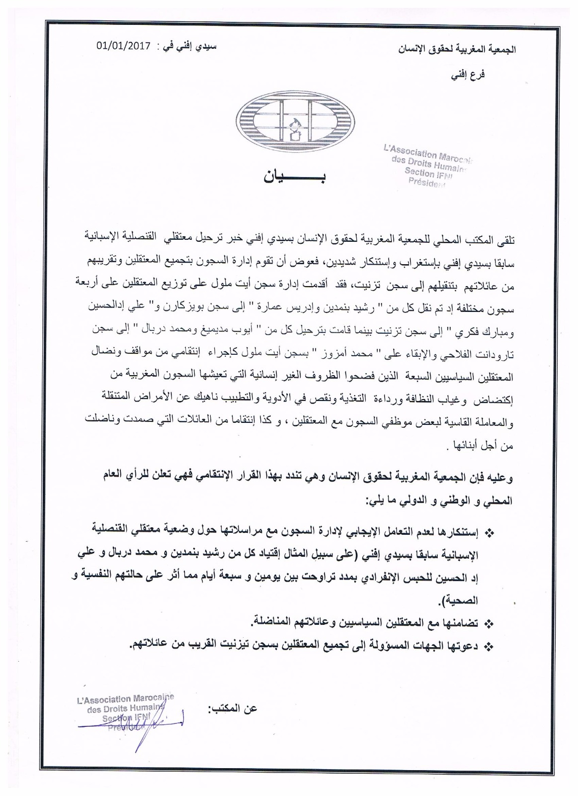 الجمعية المغربية لحقوق الإنسان فرع سيدي إفني تتضامن مع معتقلي البكاضوريا وتطالب بتنقيلهم جماعة إلى سجن تيزنيت
