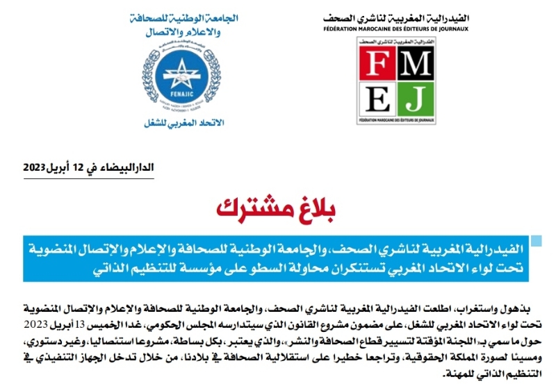 الفيدرالية المغربية لناشري الصحف، والجامعة الوطنية للصحافة والإعلام والإتصال المنضوية تحت لواء الاتحاد المغربي تستنكران محاولة السطو على مؤسسة للتنظيم الذاتي