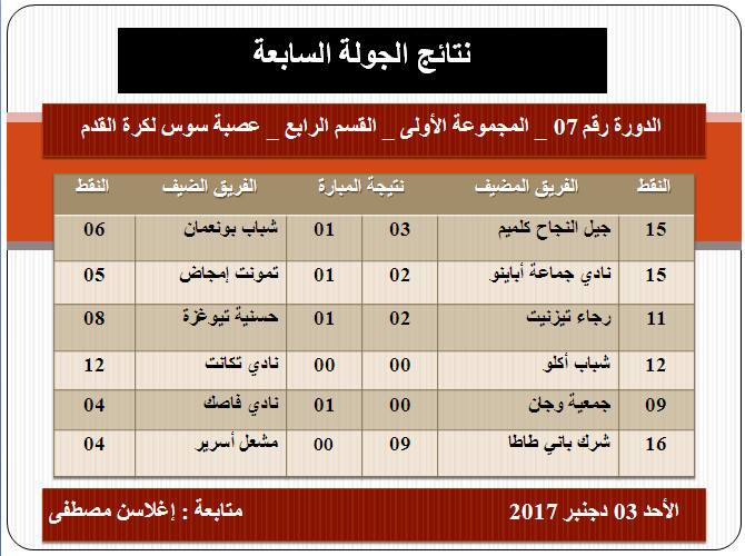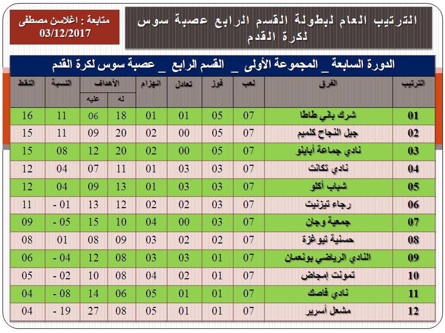 النتائج والترتيب العام لبطولة القسم الرابع لعصبة سوس لكرة القدم:الدورة السابعة (المجموعة الأولى) .أخبار الرياضة إدارة النشر نشر في 4 ديسمبر 2017 الساعة 20 و 16 دقيقة مشاركة بفايسبوكFacebookFacebookمشاركة بتويترTwitterTwitter مشاركة بواتسابWhatsAppWhatsApp Share to ارسال ايميلEmailEmail مشاركة بلينكدانLinkedInLinkedInمشاركة بمسنجرMessengerMessenger طباعةPrintطباعة رابط المشاركة :
