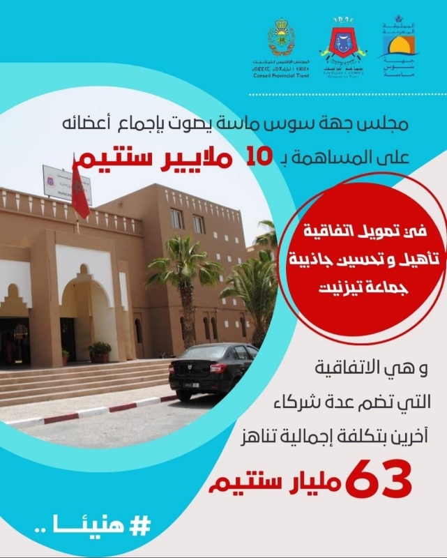 ومناسبة هذا الكلام، هي تصويت مجلس جهة سوس ماسة مشكورا، برئاسة الفاضل “كريم أشنكلي”، وبإجماع السيدات والسادة الأعضاء، على المساهمة المالية بمبلغ 10 ملايير سنتيم في تمويل اتفاقية تأهيل وتحسين جاذبية جماعة تيزنيت، التي تضم إلى جانب مجلس الجهة، عددا من الشركاء المساهمين بكلفة إجمالية تناهز 63 مليار سنتيم (636 مليون درهم)،ج من أجل تأهيل المدينة وتعزيز جاذبيتها، وتوفير عدد من المتطلبات التنموية بها، كما تجيب بشكل مباشر على أسئلة بعض المشككين في نجاح التجربة وهي لا تزال في أيامها الأولى.