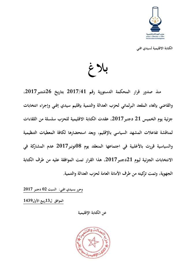 بلاغ بخصوص موقف حزب العدالة والتنمية من المشاركة في الانتخابات الجزئية باقليم سيدي افني