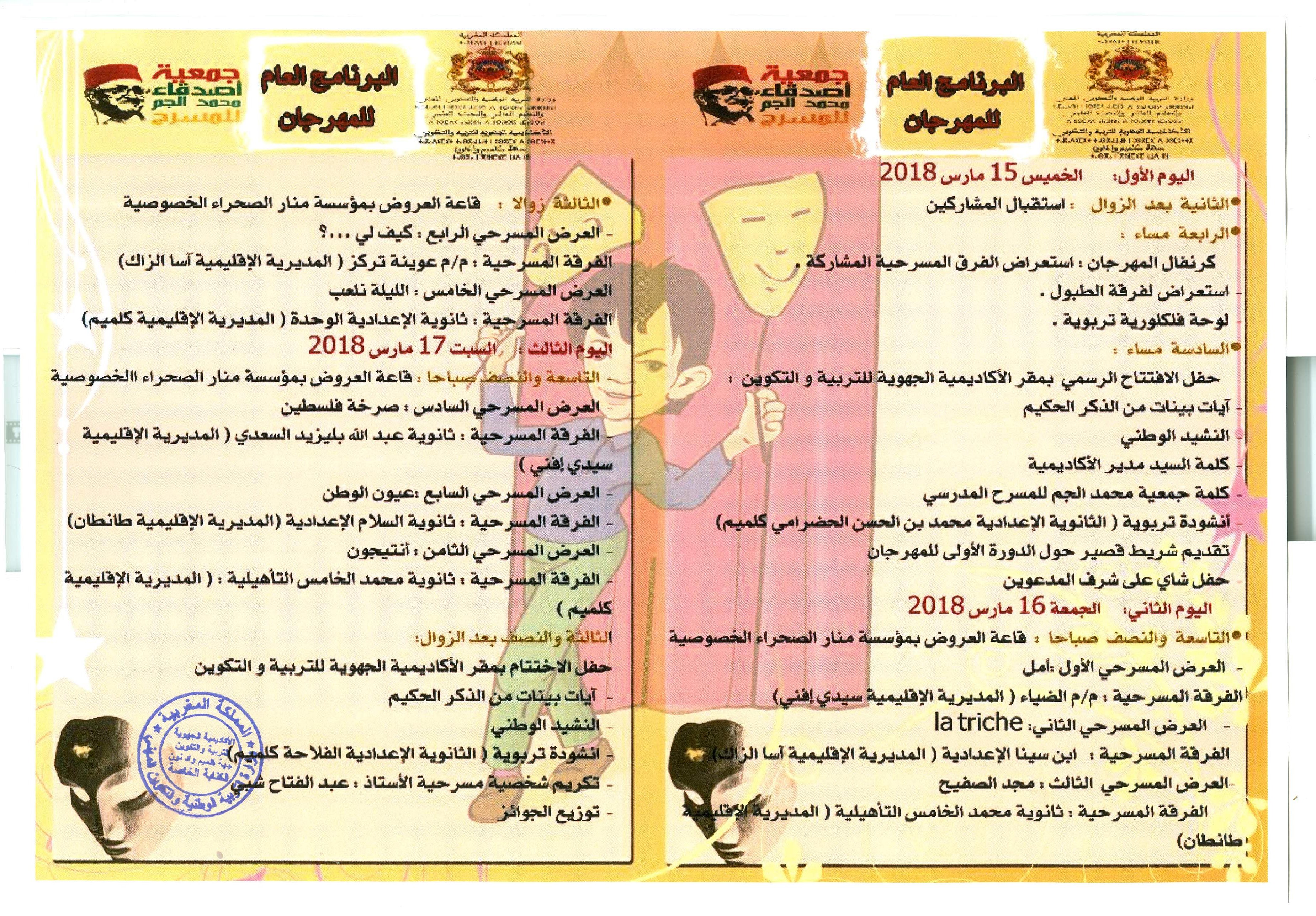 تنظم الأكاديمية الجهوية للتربية والتكوين لجهة كلميم وادنون بشراكة مع جمعية أصدقاء محمد الجم للمسرح المدرسي- فرع كلميم فعاليات المهرجان الجهوي للمسرح المدرسي في نسخته الثانية تحت شعار:”المسرح المدرسي: إبداع وتربية على القيم”.