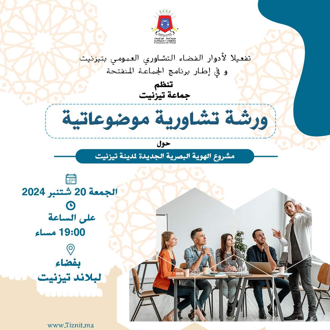احتضن فضاء “البلاند” بمدينة تيزنيت، مساء الجمعة 20 سبتمبر 2024، لقاء تشاوريا موضوعاتيا حول مشروع الهوية البصرية الجديدة لمدينة تيزنيت، وذلك بمبادرة من جماعة تيزنيت، شهد اللقاء حضور رئيس الجماعة وبعض أعضاء المجلس الجماعي إلى جانب عدد من الفعاليات الجمعوية المحلية، حيث تمحور النقاش حول إشراك المجتمع المدني في صياغة شعار وهوية بصرية جديدة تعكس تنوع المدينة وخصوصيتها الثقافية والحضارية.