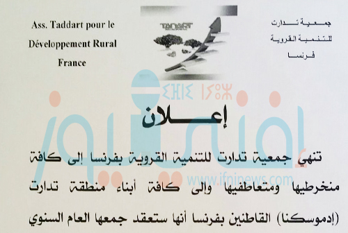 تنهي جمعية تدارت للتنمية القروية بفرنسا إلى كافة منخرطيها ومتعاطفيها وإلى كافة أبناء منطقة تدارت (إدموسكنا) القاطنين بفرنسا أنها ستعقد جمعها العام السنوي يوم الأحد 05 فبراير 2017 بمقر جمعية العمال المغاربة بفرنسا الكائن بمدينة GENNEVILLIERS ضاحية باريس مباشرة بعد صلاة الظهر ويتضمن جدول أعمال هذا الإجتماع ما يلي :