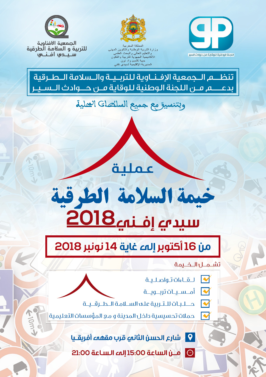 نظمت الجمعية الافناوية للتربية والسلامة الطرقية سيدي افني النسخة الأولى من خيمة السلامة الطرقية، الدورة التي انطلقت منذ يومه الثلاثاء 15 أكتوبر 2018 وستمتد إلى غاية 14 نونبر المقبل، أنشطة متنوعة لمدة 30 يوما من التحسيس والتوعية من مخاطر الطرقات، هذه العملية التوعوية نظمتها الجمعية المذكورة بشراكة مع اللجنة الوطنية للوقاية من حوادث السير وبتنسيق مع المفوضية الإقليمية للأمن الوطني والسلطة المحلية والوقاية المدنية والمديرية الاقليمية التجهيز والنقل واللوجستيك والماء والمديرية الاقليميية لوزارة التربية الوطنية والفحص التقني والمجلسين الجماعي والاقليمي بسيدي إفني،