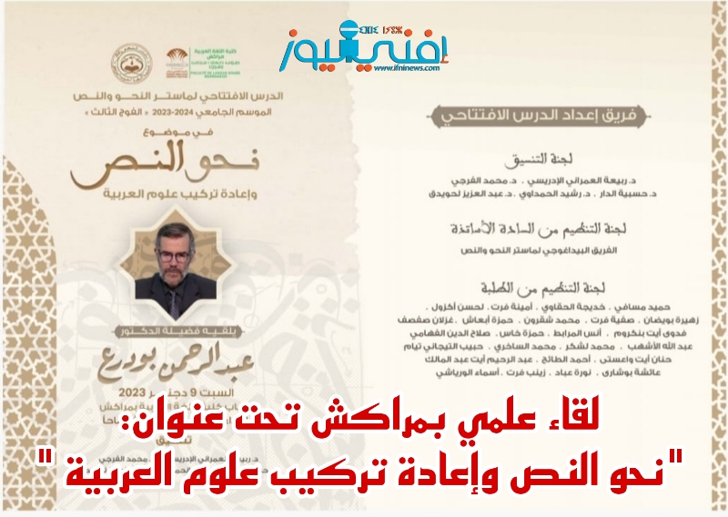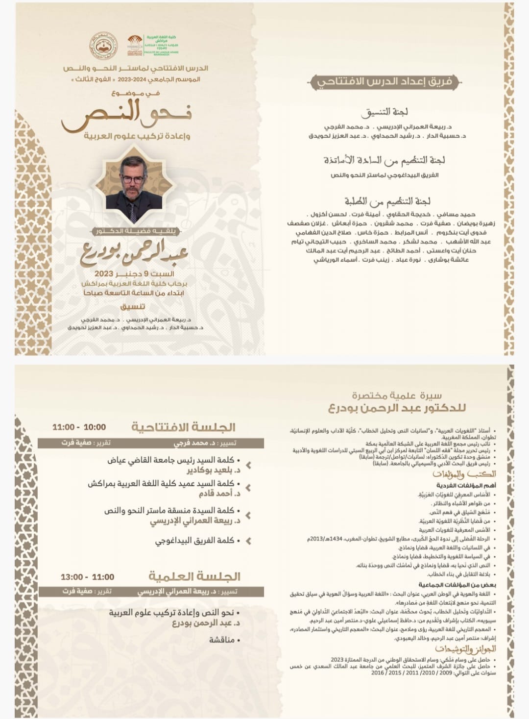 ينظم ماستر النحو والنص لقاء علميا متميزا بمناسبة درسه الافتتاحي للموسم الجامعي:2023 /2024 (الفوج الثالث) في موضوع: نحو النص وإعادة تركيب علوم العربية، يلقيه فضيلة الدكتور: عبد الرحمن بودرع يوم السبت 09 دجنبر 2023 برحاب كلية اللغة العربية بمراكش ابتداء من الساعة التاسعة صباحا. اللقاء العلمي من تنسيق د .ربيعة العمراني الإدريسي . د. محمد الفرجي د. حسبية الدار – د. رشيد الحمداوي. د. عبد العزيز لحويدق.