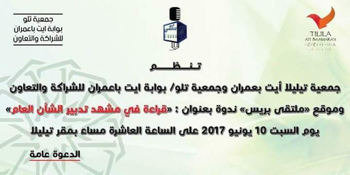 سيحتضن مقر جمعية تليلا أيت بعمران يوم السبت المقبل بحول الله ندوة بعنوان : قراءة في مشهد تدبير الشأن العام . الندوة تنظمها جمعية تيليلا و جمعية تلو بوابة أيت بعمران و موقع ملتقى بريس و اليكم برنامج الندوة :